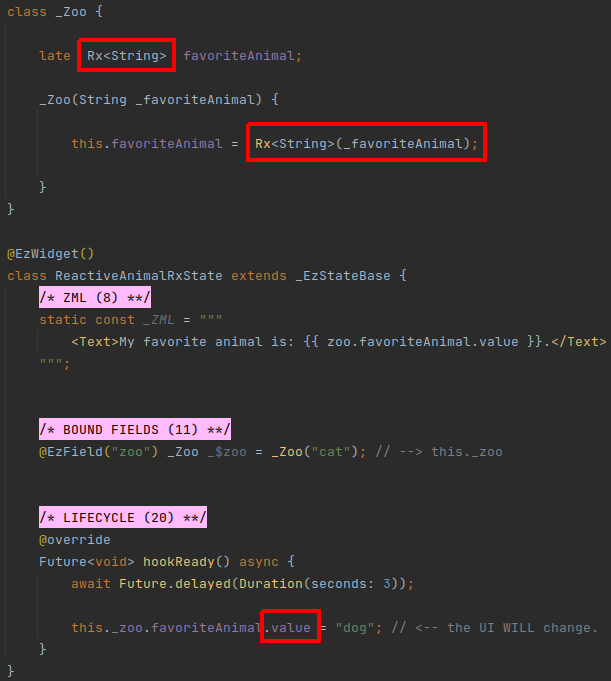 In the above example, _Zoo.favoriteAnimal is reactive, and so the text in the UI changes after three seconds from